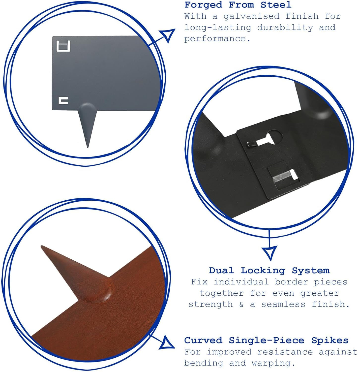 Each edging piece features a series of 8cm spikes, formed from the same piece of metal and bent to ensure maximum strength and stability once pierced into the ground.