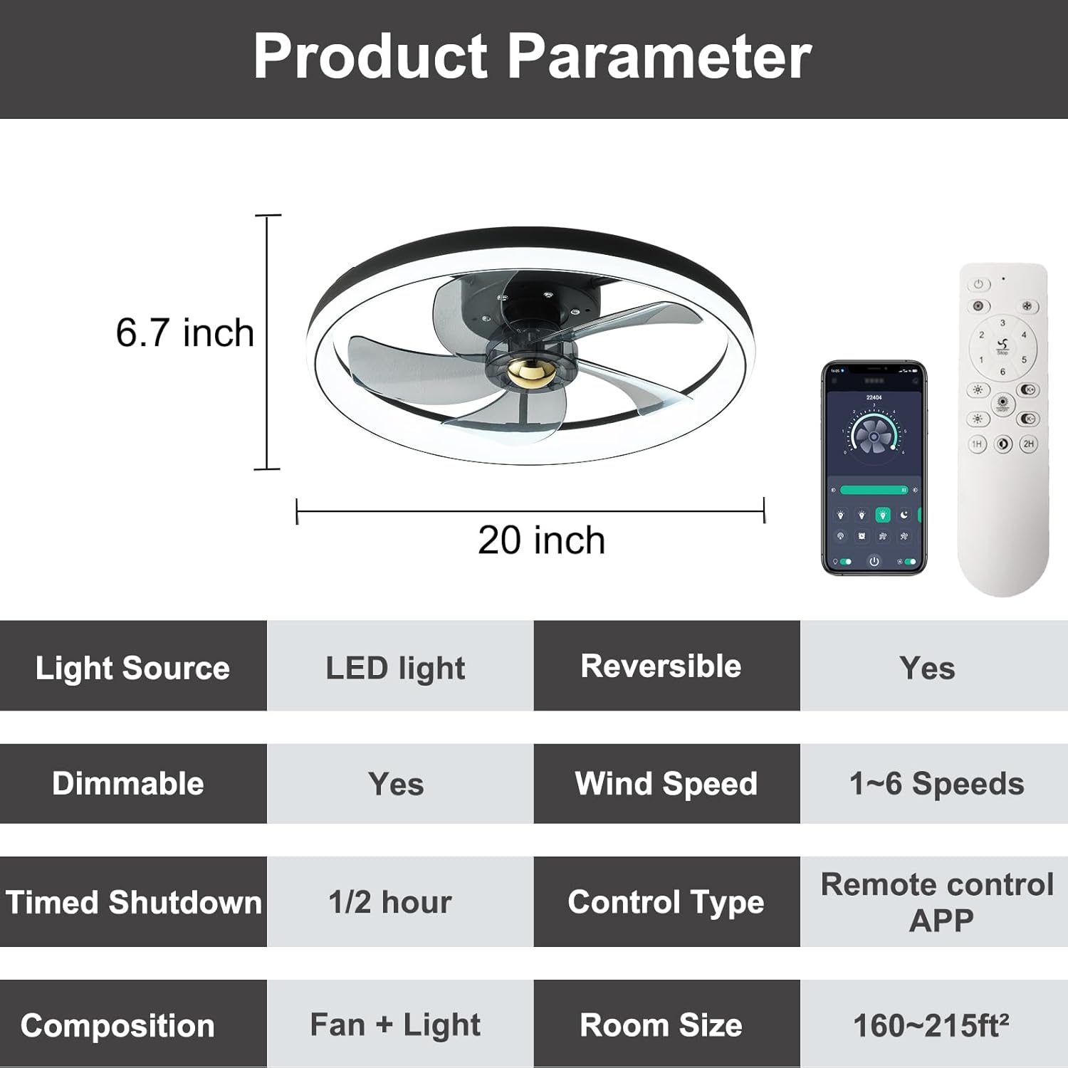 Reversible Quiet Ceiling Fan: The Reversible ceiling fan light have a reversible function.In hot weather,the downward air flow helps to cool the air and achieve coolness;In winter,the upward air flow helps to circulate the indoor air and drives the air to make the air unobstructed.Silent fan light ceiling with wifi motor provides powerful airflow,saves energy,and has a noise of less than 32dB.